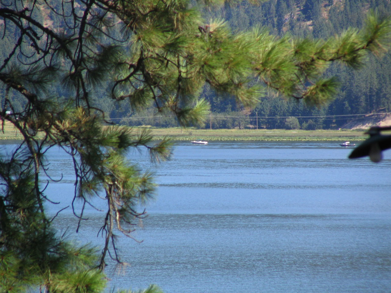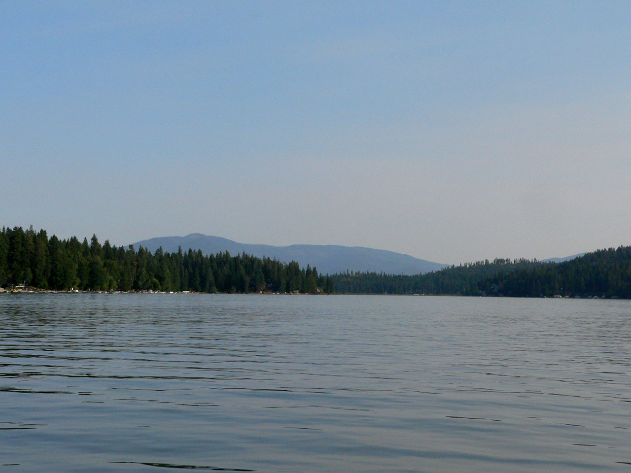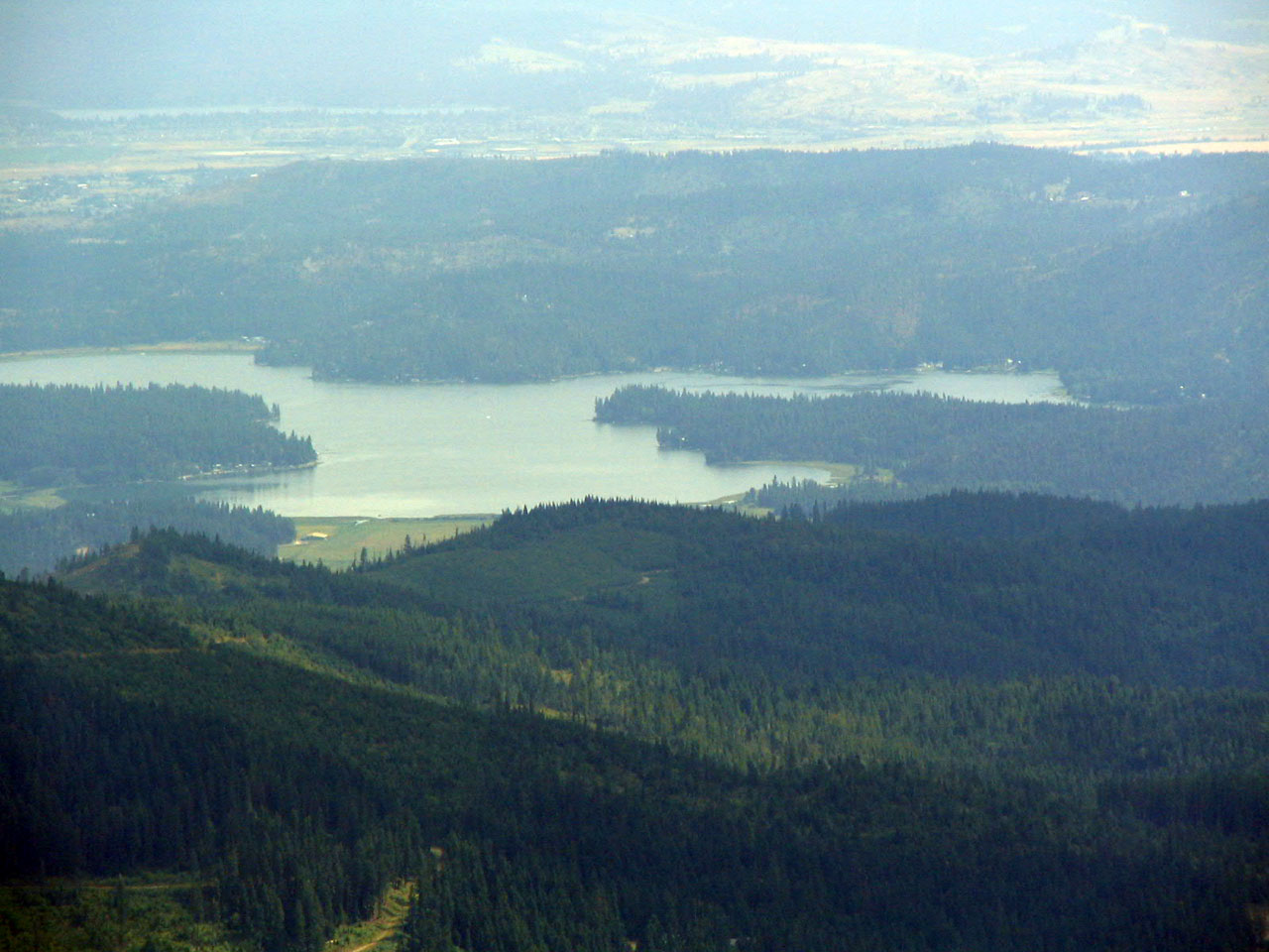 A closer view of Newman Lake as seen from the top of a mountain to the north.
